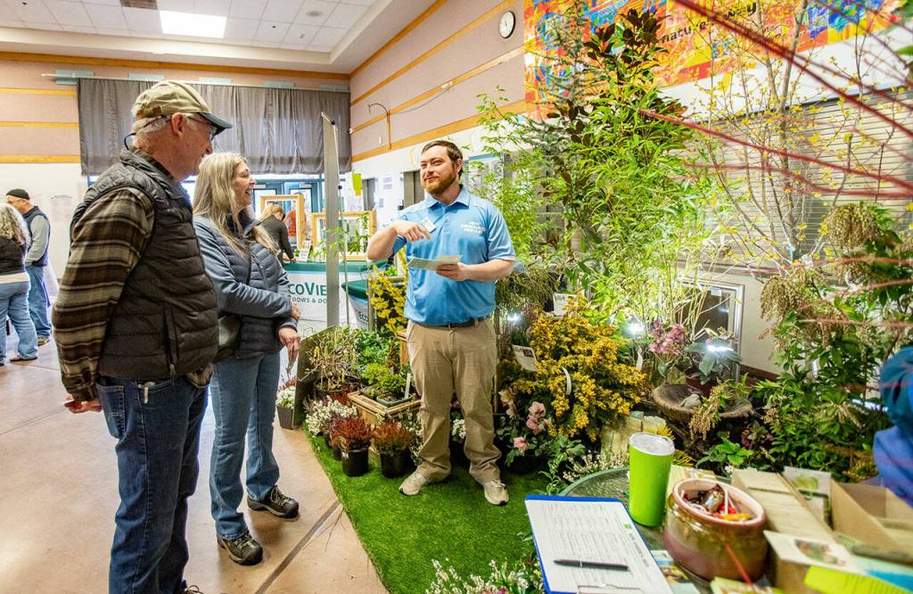 Stewart Cockburn from New Dungeness Nursery in Sequim explains landscaping ideas to Steve Sodorff and his wife Patti of Port Townsend while attending the annual Jefferson County Home Builders’ Association Home Show on Saturday at Blue Heron Middle School.