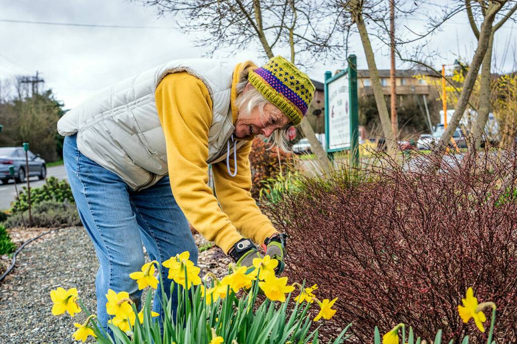 Master Gardener Honey Niemann of Port Townsend trims a barberry bush on Wednesday to keep it from infringing on the daffodils blooming at Master Gardener Park at the corner of 10th Street and Sims Way in Port Townsend.