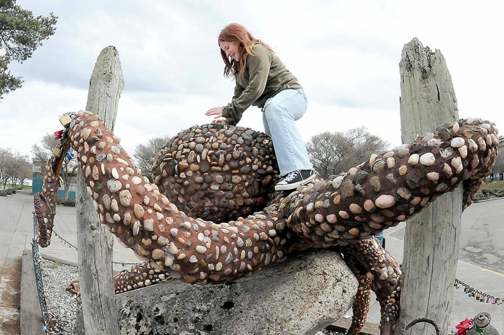 Violet Morris, 9, of Port Angeles climbs on “The Rocktopus,” a steel, rock and masonry sculpture on Friday at Port Angeles City Pier. The sculpture was originally designed by artist Oliver Strong as a topiary creation, but was later reworked with stone and mortar by artist Maureen Wall with support from Soroptimist International Port Angeles Jet Set, the City of Port Angeles and the Girl Scouts.