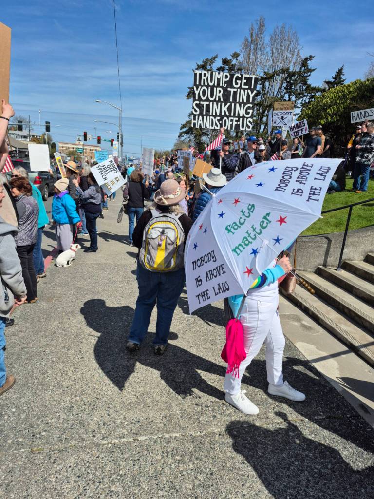 More than 1,000 protest placards were on display during the Hands Off rally Saturday along Sims Way in Port Townsend. Rally attendance swelled to an estimated 3,000-4,000 people who lined Sims Way between Haines Place and Kearney Street. (Steve Mullensky/For Peninsula Daily News)