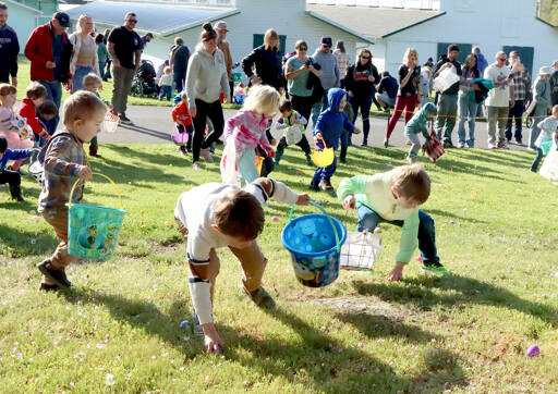 This excited toddler is focused on his next prize and misses the ones right in front of him during the 95th annual Port Townsend Elks Club Easter Egg Hunt at Chetzemoka Park on Sunday. Volunteers hid more than 1,500 plastic eggs around the park with some redeemable for prizes.