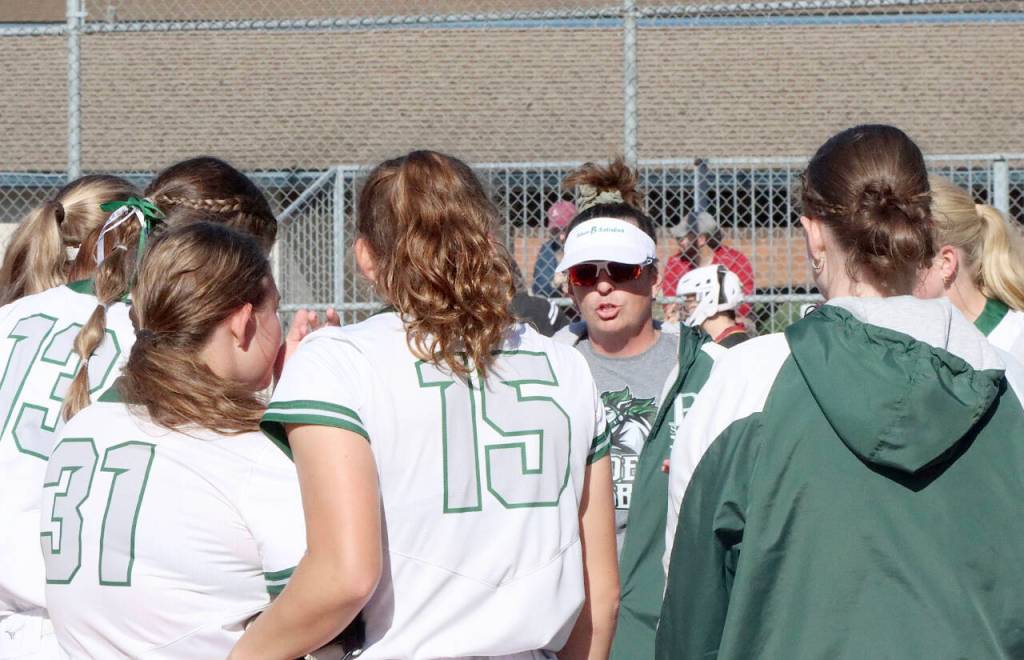 Coach Morgan Worthington talks to her players between innings at a game last week at Dry Creek Elementary. The Roughriders go in to the state tournament Friday ranked No. 3 in the state. (Dave Logan/for Peninsula Daily News)