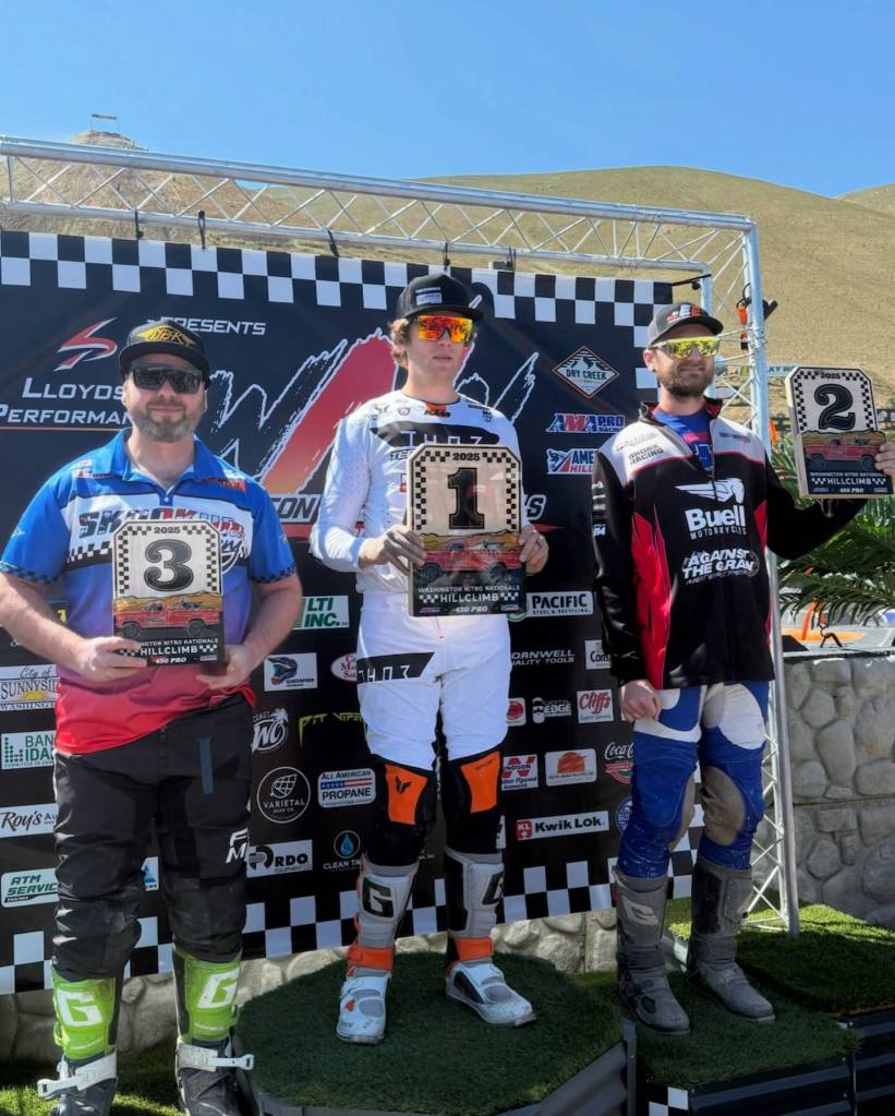 Port Angeles’ Jake Anstett, center, won the 450cc division of the American Motorcycle Association Pro Racing’s Washington Nitro Nationals Hillclimb in Sunnyside over the weekend. (Washington Nitro Nationals Hillclimb)