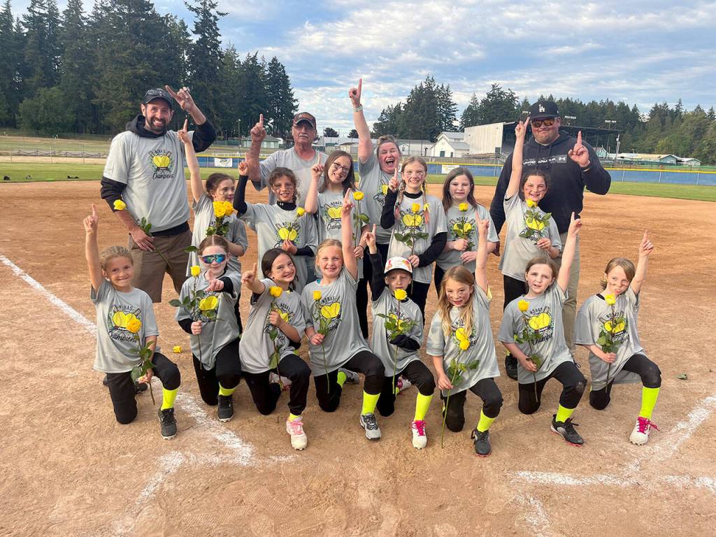 KONP claimed the North Olympic Baseball and Softball 16U Seniors Softball championship recently at Jim Lunt Field at Lincoln Park. Seniors Softball 16U – KONP (Pink shirts) Back row, from left, assistant Coach Rick Melvin, assistant Coach Curt Stern, Maci Pressley, Aubrey Whitaker, Allison Leitz, Chloe Underwood, Peyton Smith, head coach Kayla Yoshioka, assistant coach Scott Hedrick. Front row, Clara Berry, Madison Knapp, Maggie Conkle, Keira Headrick, Erika Osterberg, Nyah Langdon and Jayden DeGoede.