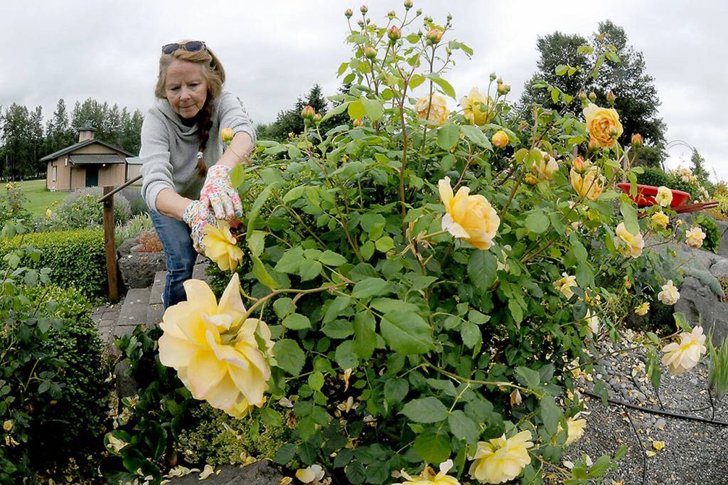 Denise Thornton of Sequim deadheads roses on a flower display at the Sequim Botanical Garden at the Water Reuse Demonstration Park at Carrie Blake Park on Wednesday in Sequim. Thornton, a volunteer gardener, was taking part in a work party to maintain the beauty of the garden.