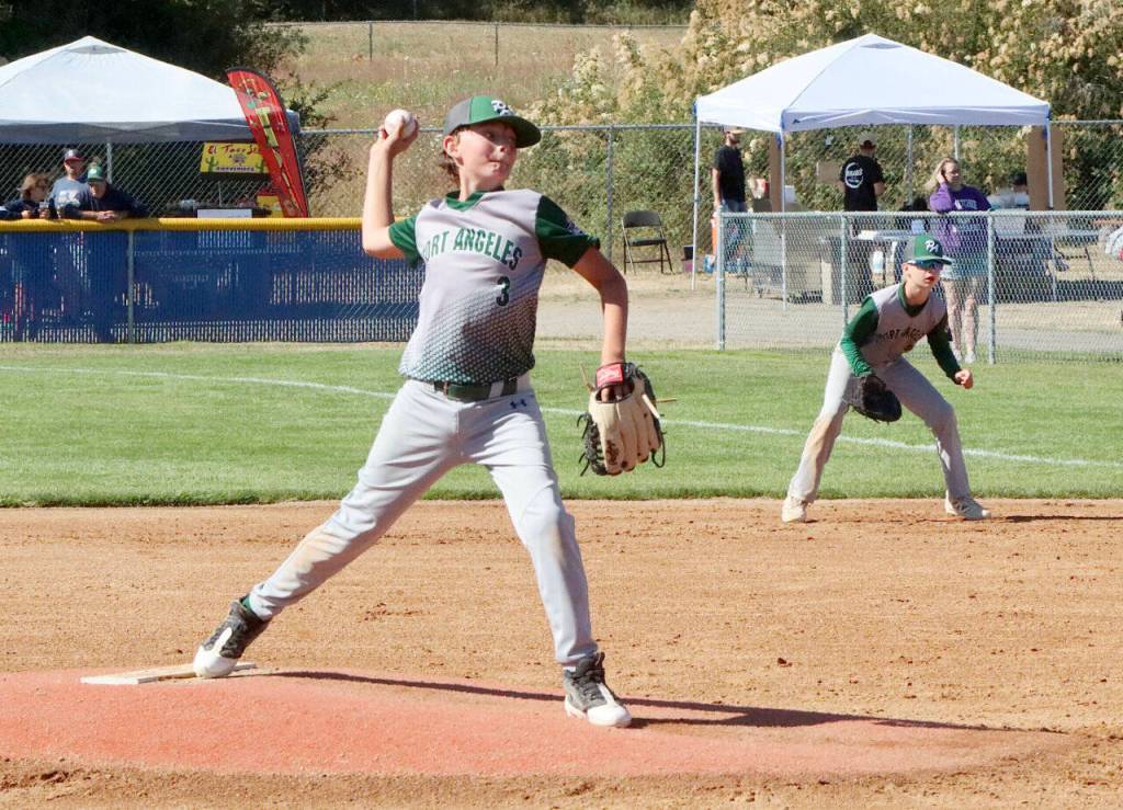 Jack Rudd pitches for the Port Angeles 12U team in a semifinal game against Wenatchee Saturday morning at the Port Angeles Baseball Complex. Grant Lancaster is the 1st baseman ready for what the hitter hits. Port Angeles beat Wenatchee 9-0 to advance to the title game.