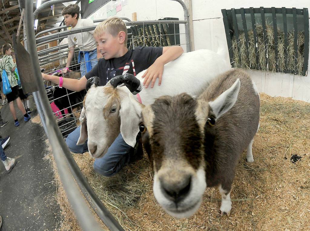 Colton McEwan, 8, a member of the Port Angeles-based Lambchops 4H Club, urges passers-by to pet his show goats, Shooter and Oatey, in the goat and sheep barn at Thursday at the Clallam County Fair. In the background is fellow 4-H Club member Wesley Harmon, 8. (Keith Thorpe/Peninsula Daily News)