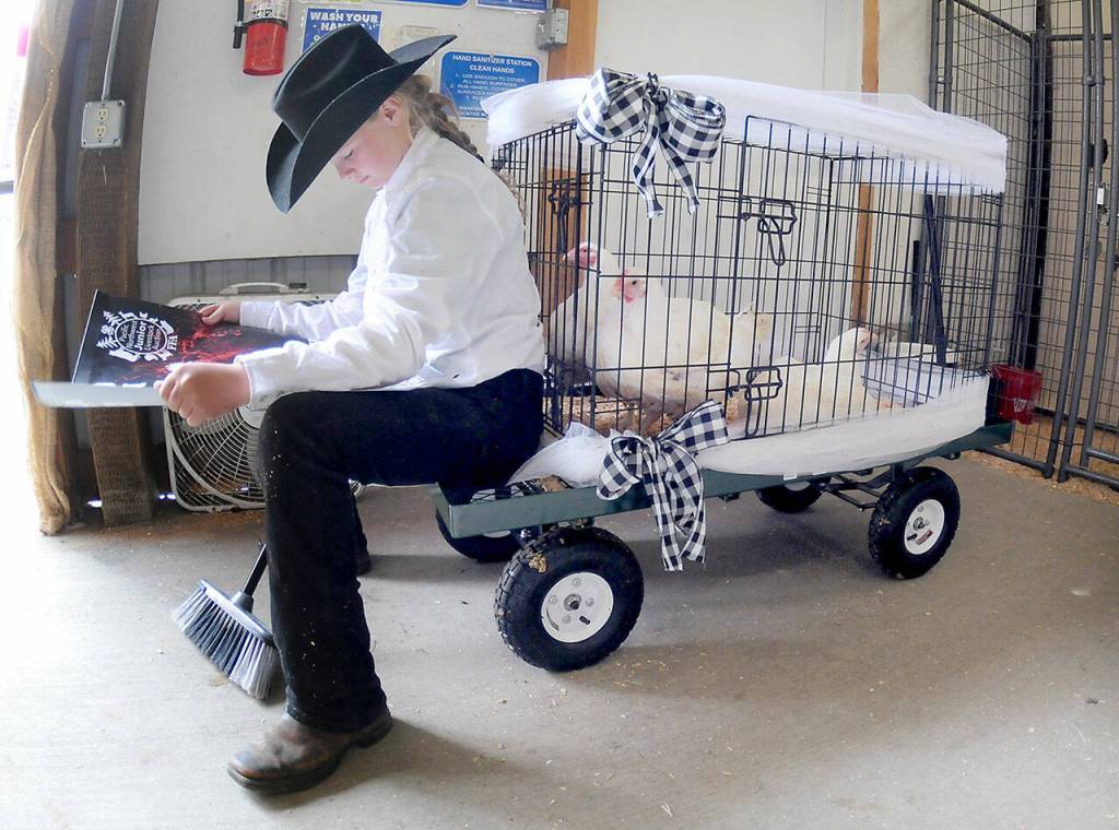 Natilee Winters, 11, a member of the Port Angeles-based Lambchops 4-H Club, sits on a display cart with her chickens as she awaits her turn in the auction ring during the Pacific Northwest Junior Livestock Auction on Saturday at the Clallam County Fair.