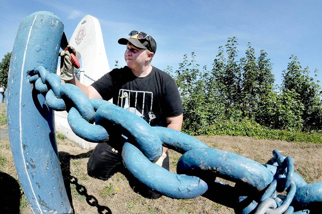 Port Angeles Parks and Recreation Department employee Jessica Adams scrapes off flaking paint from a bollard along the parking area at Haynes Viewpoint on Thursday in Port Angeles.