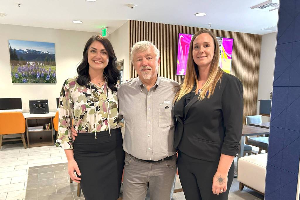 Leaders with Holiday Inn Express & Suites, from left, Namaste Stayton, vice president of hotel operations, Bret Wirta, owner, and Shelby Schleve, general manager, stand in “The Great Room” of the Sequim hotel. It was part of a massive $4 million remodeling project that opened up this space, refreshed hotel rooms and suites and added new amenities throughout the building.
