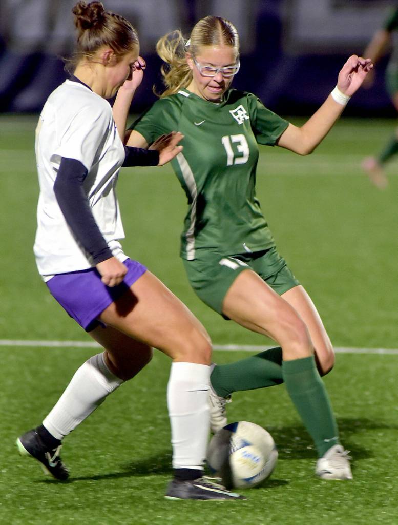 Port Angeles' Morgan Politika, right, charges past Sequim's (#7) during Thursday night's match in Port Angeles.
