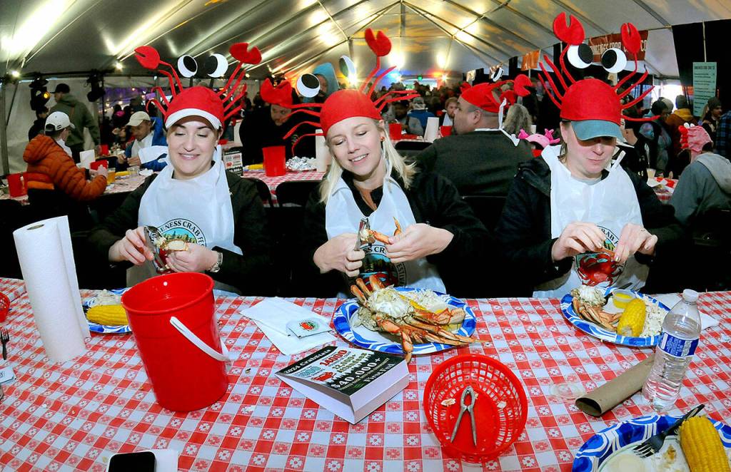 Festival-goers, from left, Cara Saunto, Shelby Damiani and Adrienne Bohannon, all of Seattle, crack into their crab dinners on Saturday at the Dungeness Crab Festival on the Port Angeles waterfront. The annual event drew thousands of visitors to downtown Port Angeles for a variety of seafood delights, music, cooking demonstrations, a craft fair and other activities.