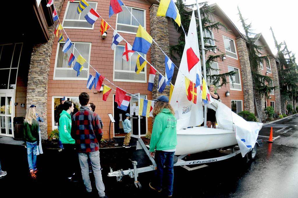 Youth mariners string pennants from a sailboat in the driveway of Olympic Lodge in Port Angeles in preparation for Wednesday’s Float the Boat fundraising event. (Keith Thorpe/Peninsula Daily News)