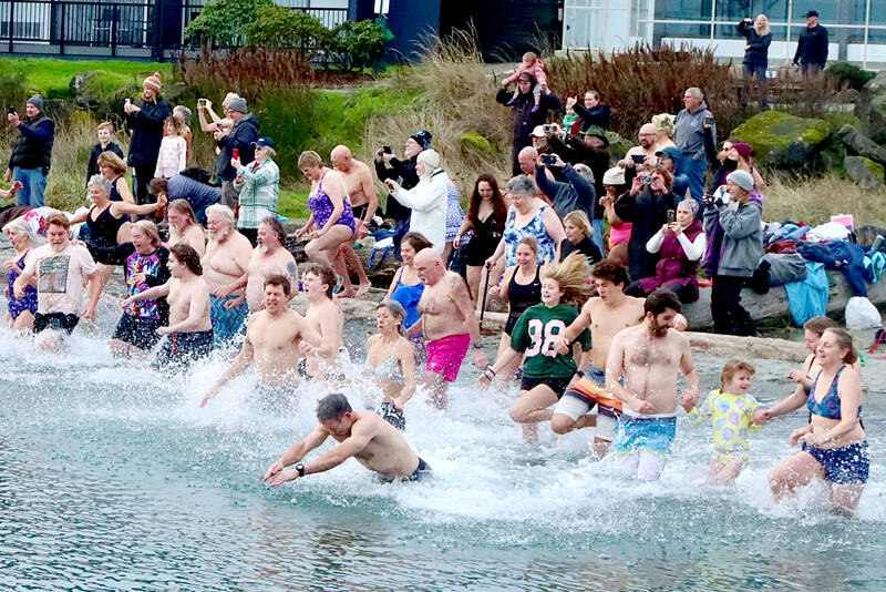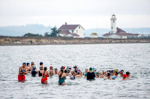 About 100 people dipped three times into the water during the 38th annual Polar Bear Dip on Thursday at Hollywood Beach in downtown Port Angeles. The air and water temperature were both in the low 40s.
