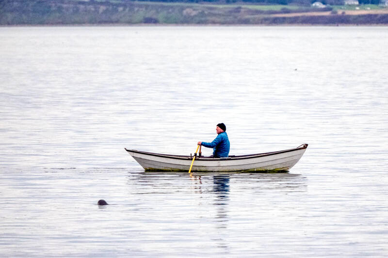 A seal pops its head out of the water as a dory rower propels his craft in the calm waters of the Salish Sea. Whidbey Island is in the distance. Today’s high temperature is forecast to be in the low 50s with partly cloudy skies. Rain is set to return this weekend.