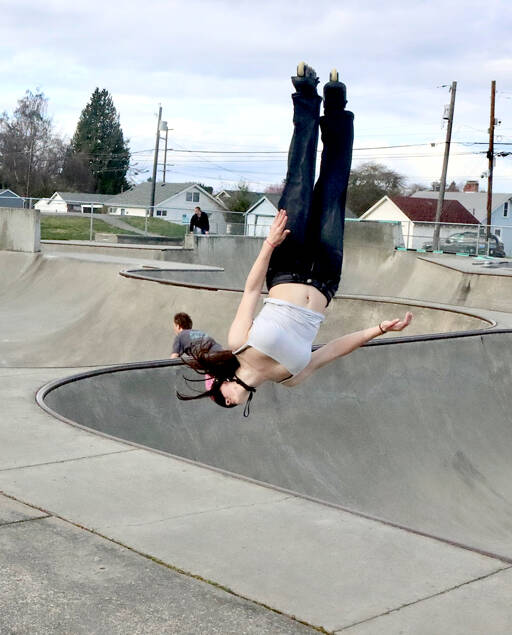 Liliana Scordino, 17, of Neah Bay takes time out four days a week from her classes at Peninsula College to practice her skills using her inline skates at the Port Angeles Skate Park next to Erickson Playfield. She has learned to do flips out of the skate park bowl with regular consistency.