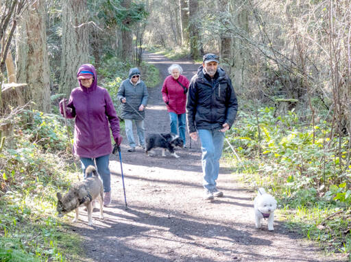 A group of walkers and their furry companions hike along Mule Barn Road at Fort Worden State Park in Port Townsend.