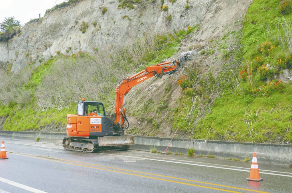 A Port Townsend backhoe operator moves dirt to stabilize the bluff along Water Street that sloughed off overnight last week due to excessive rain.