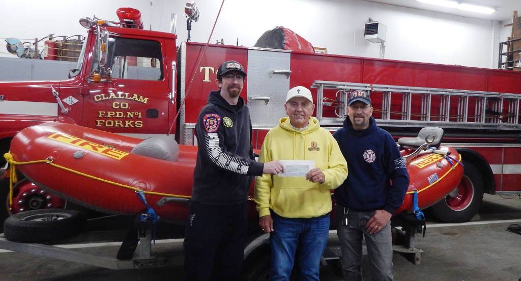 Clallam County Fire District 1 firefighters Chris Martin, left, and Mike Zavadlov, right, accept a $1,000 donation from Ed Bedford of Bedford’s Craft Sodas in Port Angeles to support the department’s swiftwater rescue program and its effort to purchase a jet boat.