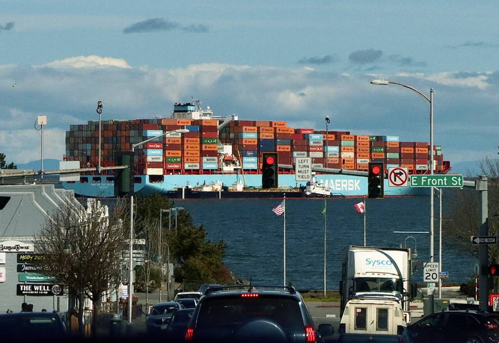 The San Vicente rests in Port Angeles Harbor on Monday as it travels with more than 9,000 containers from Vancouver, British Columbia, to Chinese ports. The ship has a length of 984 feet.
