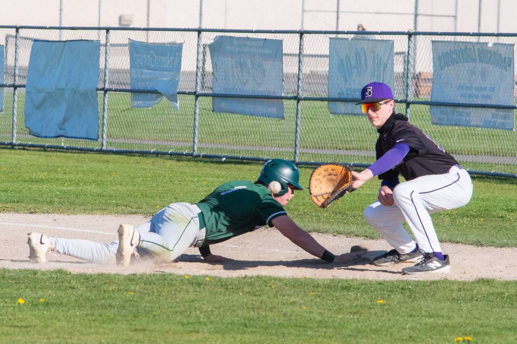Port Angeles’ Easton Fisher slides into first base as the throw comes to Sequim first baseman William Kuperus. (Emily Mathiessen/for Peninsula Daily News)