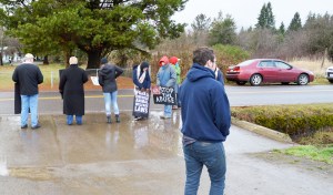 Pickets stand outside in the Forks rain in front of the Olympic Animal Sanctuary (background). Joe Smillie/Peninsula Daily News