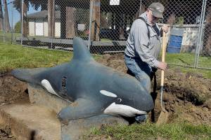 Lisa Luebben of Port Angeles digs up a dahlia root from her plot in the Fifth Street Community…