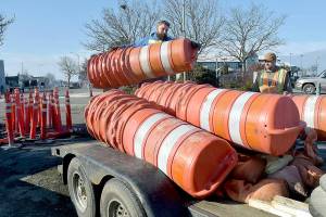 Chris Johnson of Nordland-based Nordland Construction loads traffic drums onto a trailer as coworker Robert Bufford prepares to…