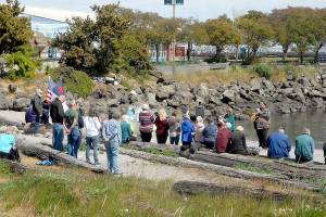 People gather on Hollywood Beach in Port Angeles for the National Day of Prayer — a nationwide event…