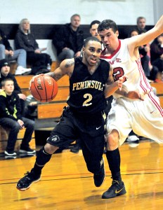 Peninsula College's Geno Horsely drives around Olympic's Jayson Brocklesby