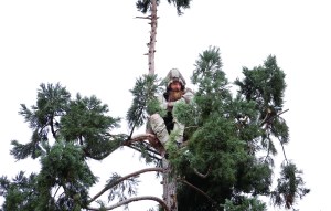 A man sits near the top of a sequoia tree Wednesday in downtown Seattle. Authorities were alerted to the unidentified man in the tree Tuesday morning