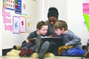 Assistant teacher D'onna Hartman reads to Frederick Frenious