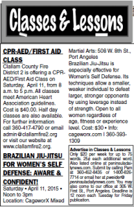 CLASSES AND LESSONS — Sign up for CPR-AED-first aid class; women’s self-defense lessons