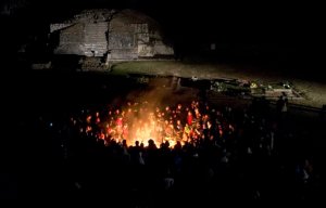 In the photo at right, people gather around a sacred fire at the Mayan archeological site of Iximche…