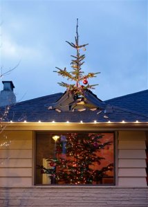 In the photo at right, a 14-foot Christmas tree appears to be crashing through the roof of a…