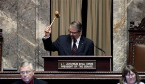 Lt. Gov. Brad Owen bangs the gavel for the final time to end a double-overtime legislature session early this morning at the state Capitol in Olympia. Ted S. Warren/The Associated Press