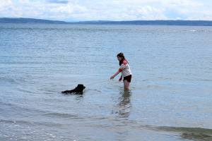 Rain Walker of Silverdale plays with her dog Bodhi in the water at the beach of Fort Worden…