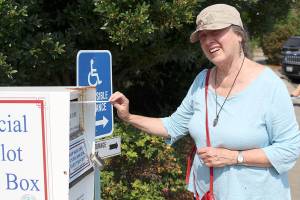 Kate Kinney of Port Townsend turns in her ballot from the primary election at the dropbox in front…