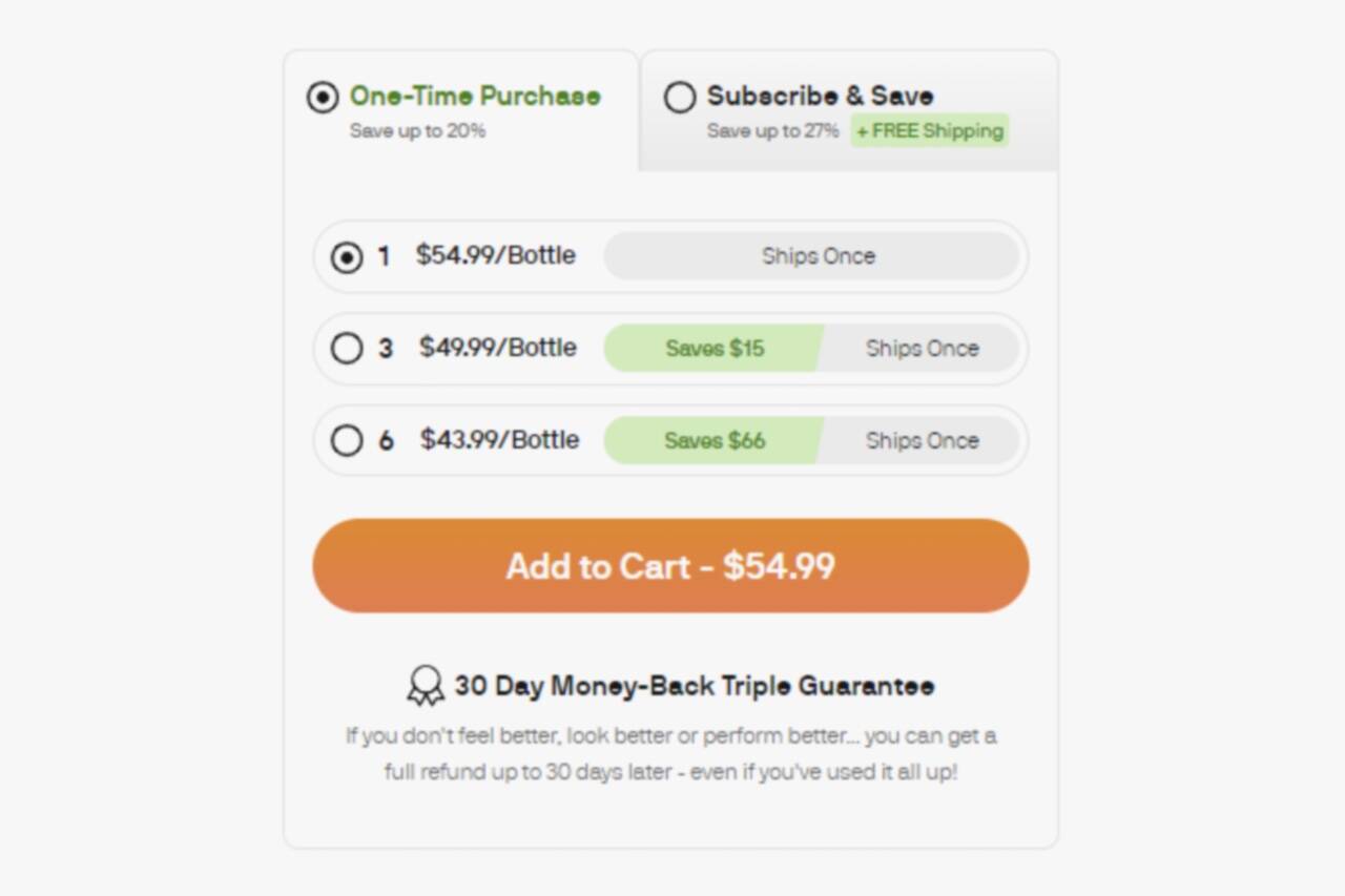 Tiered pricing: $54.99 for one bottle, $149.97 for three, $263.94 for six (Official Website)