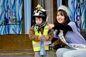 Bryant Volker smiles for Irrigation Festival photographer Keith Ross during the Kids Parade awards with help from festival Princess Kailah Blake. Volker won first place for his bicycle float. (Matthew Nash/Olympic Peninsula News Group)