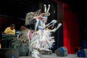 Supaman performs a “Men’s War Dance” to a full house on Thursday at the Port Townsend High School…