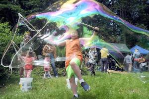 Emmett Stratford, 8, of Port Angeles creates a gigantic soap bubble as one of the children’s activities at Summertide Solstice Festival on Saturday at the Port Angeles Fine Arts Center. (Keith Thorpe/Peninsula Daily News)