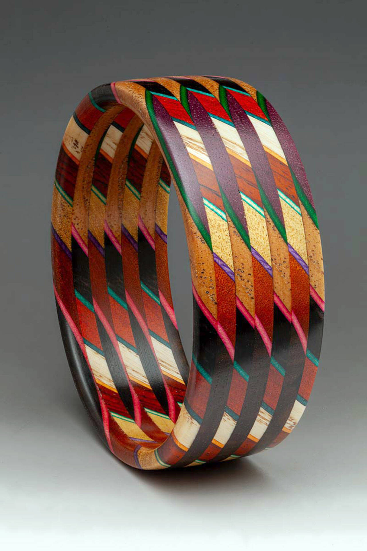 Collins creates intricate patterns through a process of lamination and turning that resemble beadwork or needlepoint.