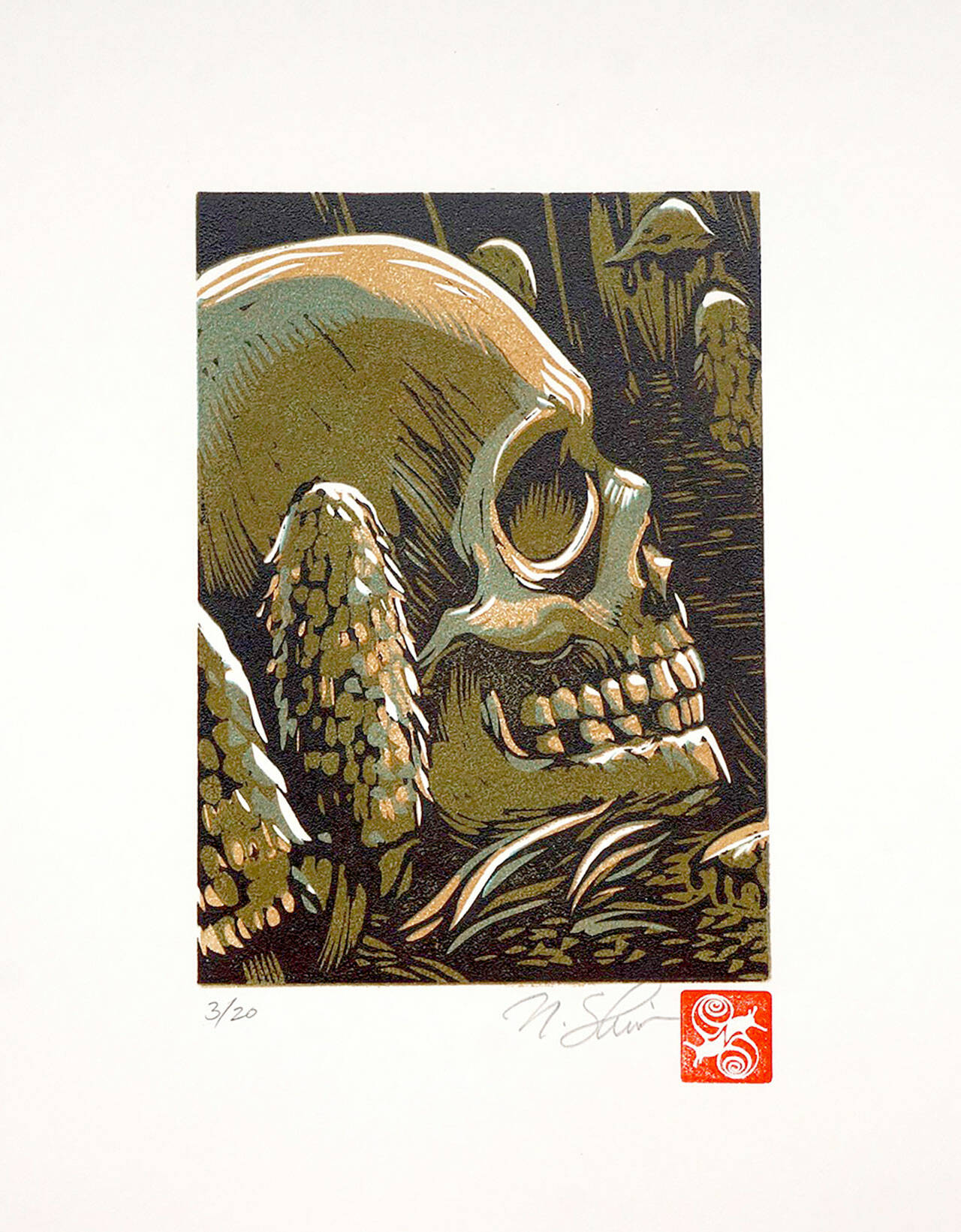 More well-known for his block prints, Shields will exhibit a series of acrylic paintings that dress often-overlooked animals in unexpectedly dignified garb.