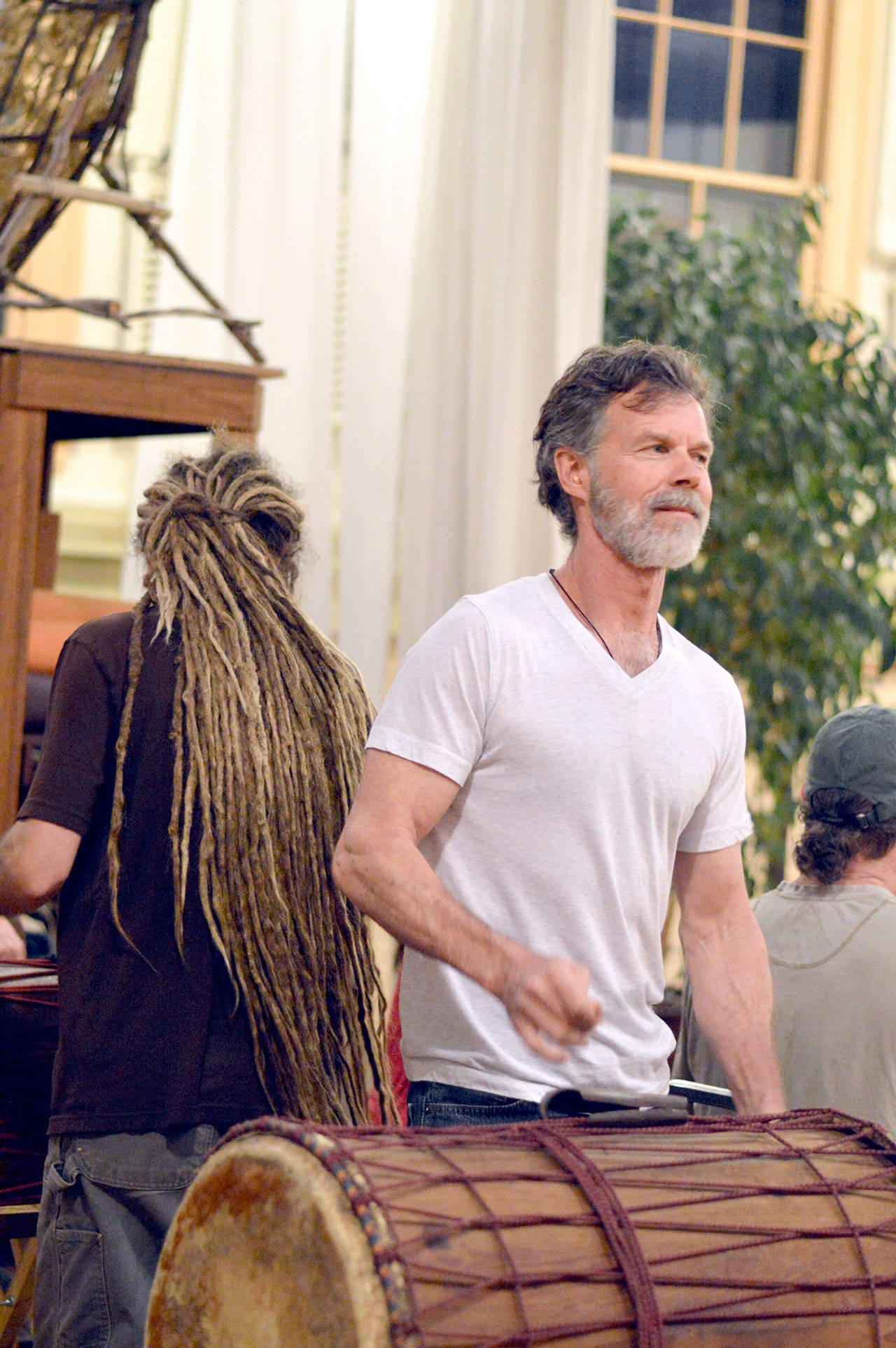 Piper Dunlap of Port Townsend drums for the dancers at the Madrona MindBody Institute. Behind him is Brian Moak of Sequim. (Diane Urbani de la Paz/for Peninsula Daily News)