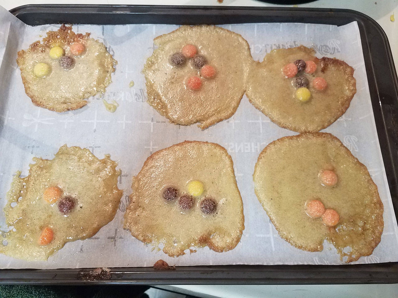 And the first batch spread across the cookie sheet and was entirely liquid when I took it out after five minutes. The edges were browning, though, so I figured they were as solid as they were going to get.