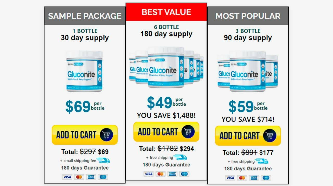 Gluconite is priced at $69 per bottle, with discounts available when ordering multiple bottles. You can exclusively buy the supplement through the official website. Each bottle is priced at $49, $59, or $69, depending on the number of bottles you order.