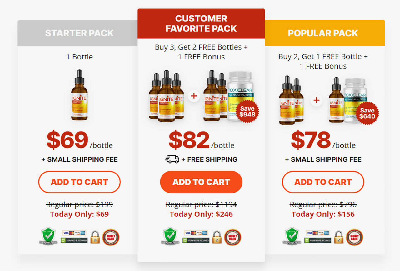 Each bottle of Ignite Drops contains 300 drops, which are enough for 30 days. To promote the product, the manufacturer includes a free bonus bottle of ToxiClear and every purchase of multi-bottle packages. ToxiClear is an all-natural body detoxifier that helps remove toxins and impurities from the body. Users take it every evening before going to bed.