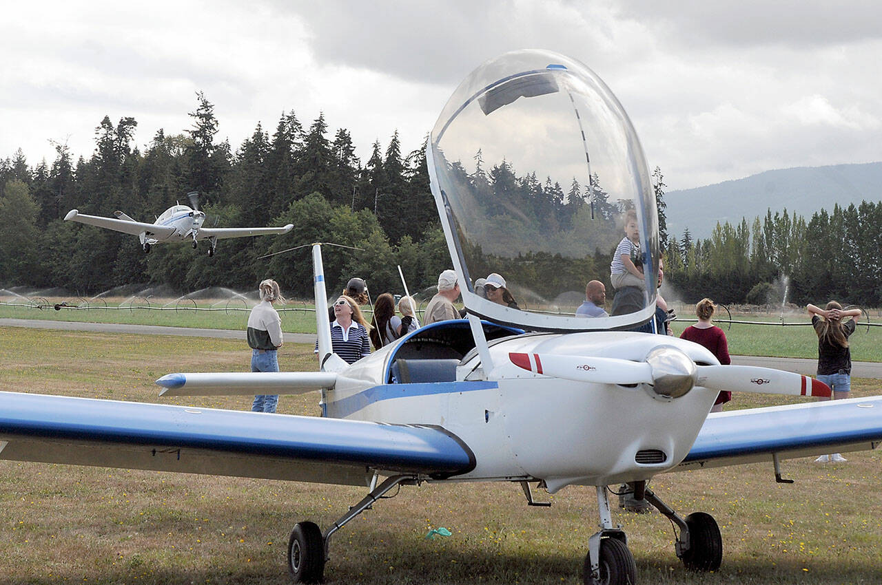 Grayson Kelm, 9, sits on the shoulders of his father, Jon Kelm of Happy Valley, Ore., to get a better look inside the cockpit of a Boeing Stearman PT-17 biplane at Air Affaire on Saturday at Sequim Valley Airport near Carlsborg.