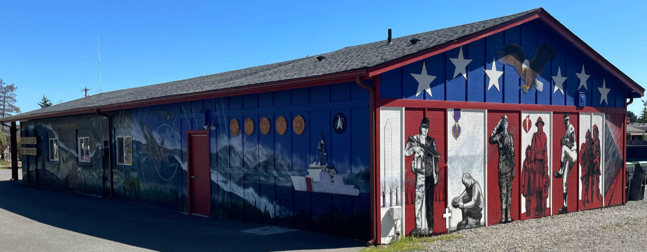 Working on several pieces from her studio north of Sequim, Klein developed a bald eagle, the war vehicles and other various aspects of the mural using alupanels — composite pieces of aluminum that can be cut and shaped. The aluminum pieces were then bolted on to the side of the building after the mural’s background was completed.